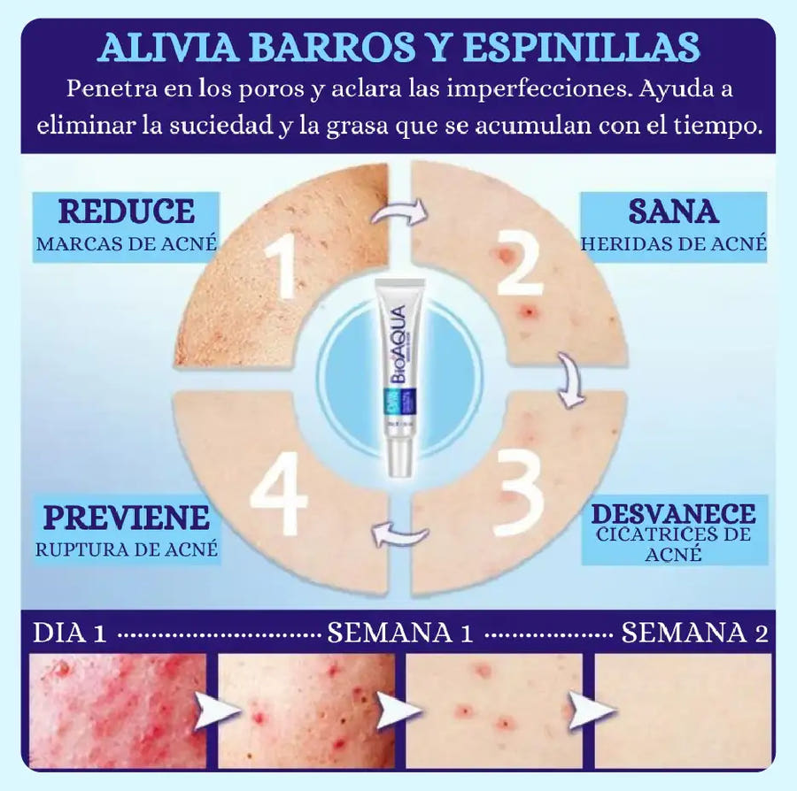 Pasar de piel con granitos, manchas y exceso de grasa a un rostro limpio, uniforme y sin cicatrices es posible con esta crema Bioaqua. Su poderosa fórmula actúa desde la primera aplicación y te devuelve la seguridad en ti misma.