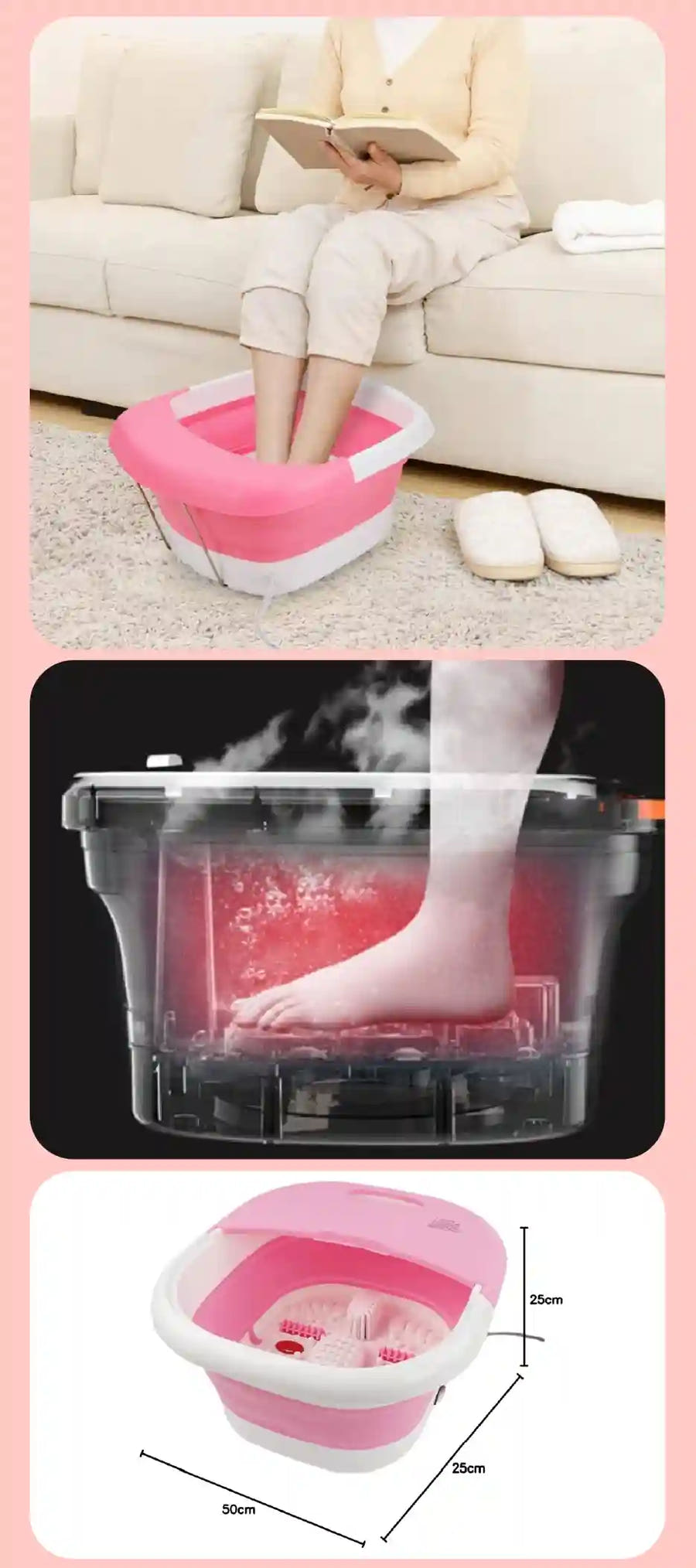 Con la tina para pedicure plegable, transforma tu espacio en un spa profesional. Relaja y rejuvenece los pies con el sistema de hidromasaje, mantén el agua caliente y disfruta de un masaje con rodillos.