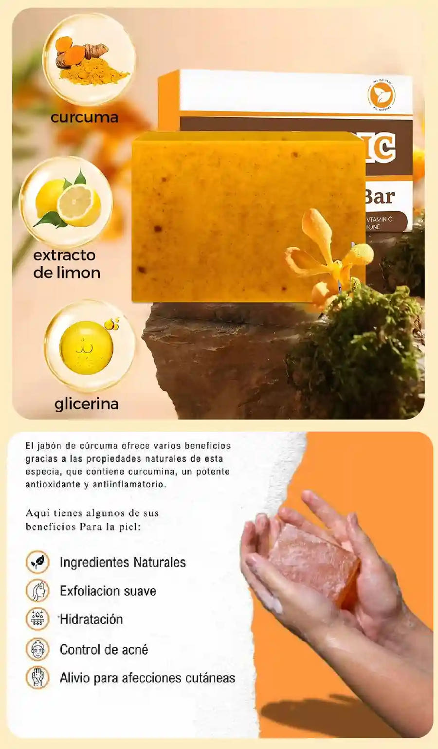 Imagina verte en el espejo y notar cómo tu piel se aclara y se siente más suave. Con el jabón de cúrcuma, no solo aclaras manchas, sino que transformas tu piel, logrando una textura más suave, fresca y revitalizada. ¡Recibe los resultados visibles con uso constante!